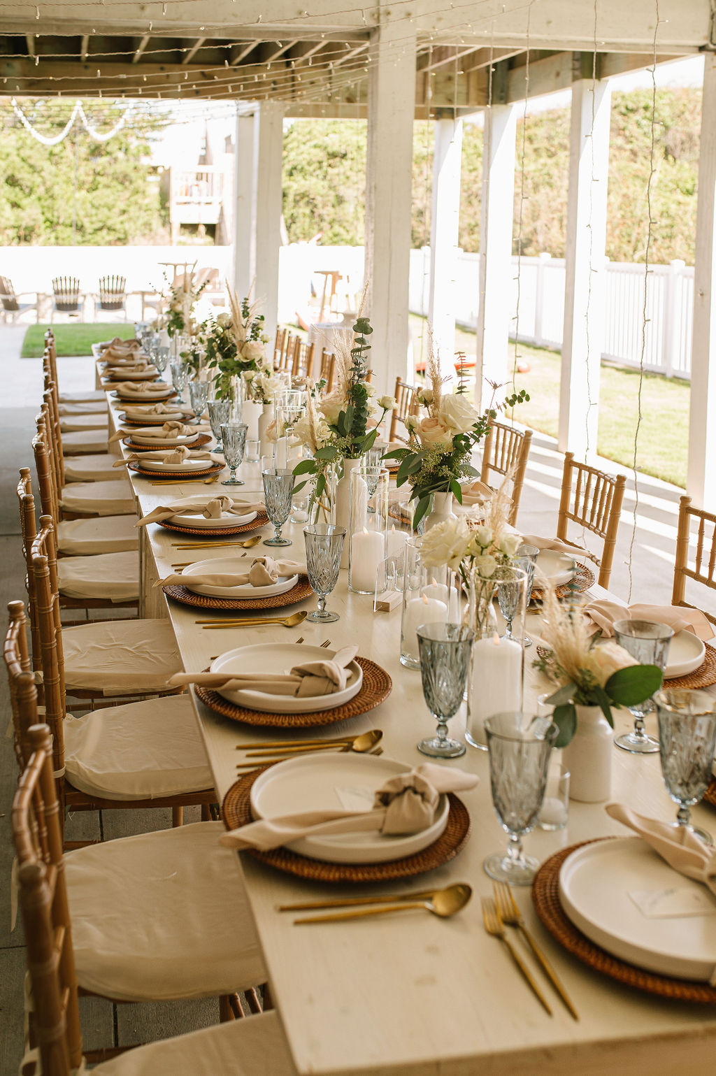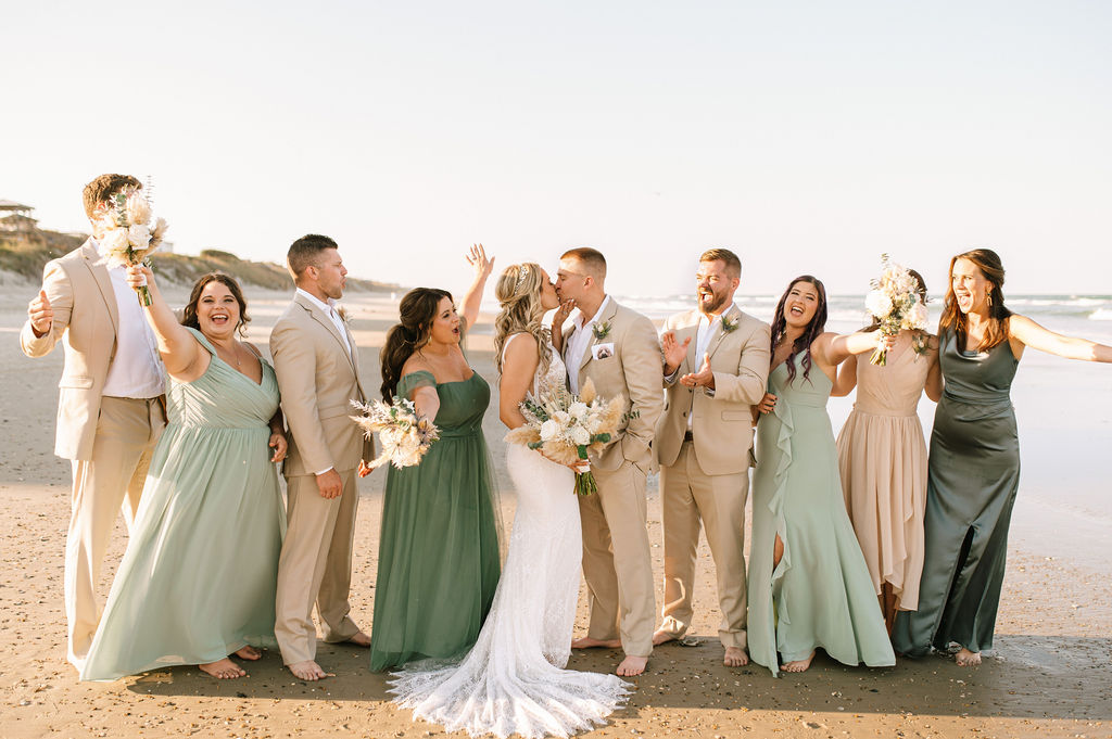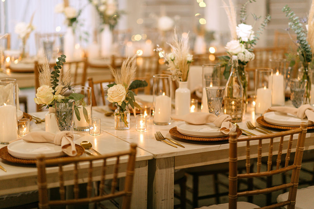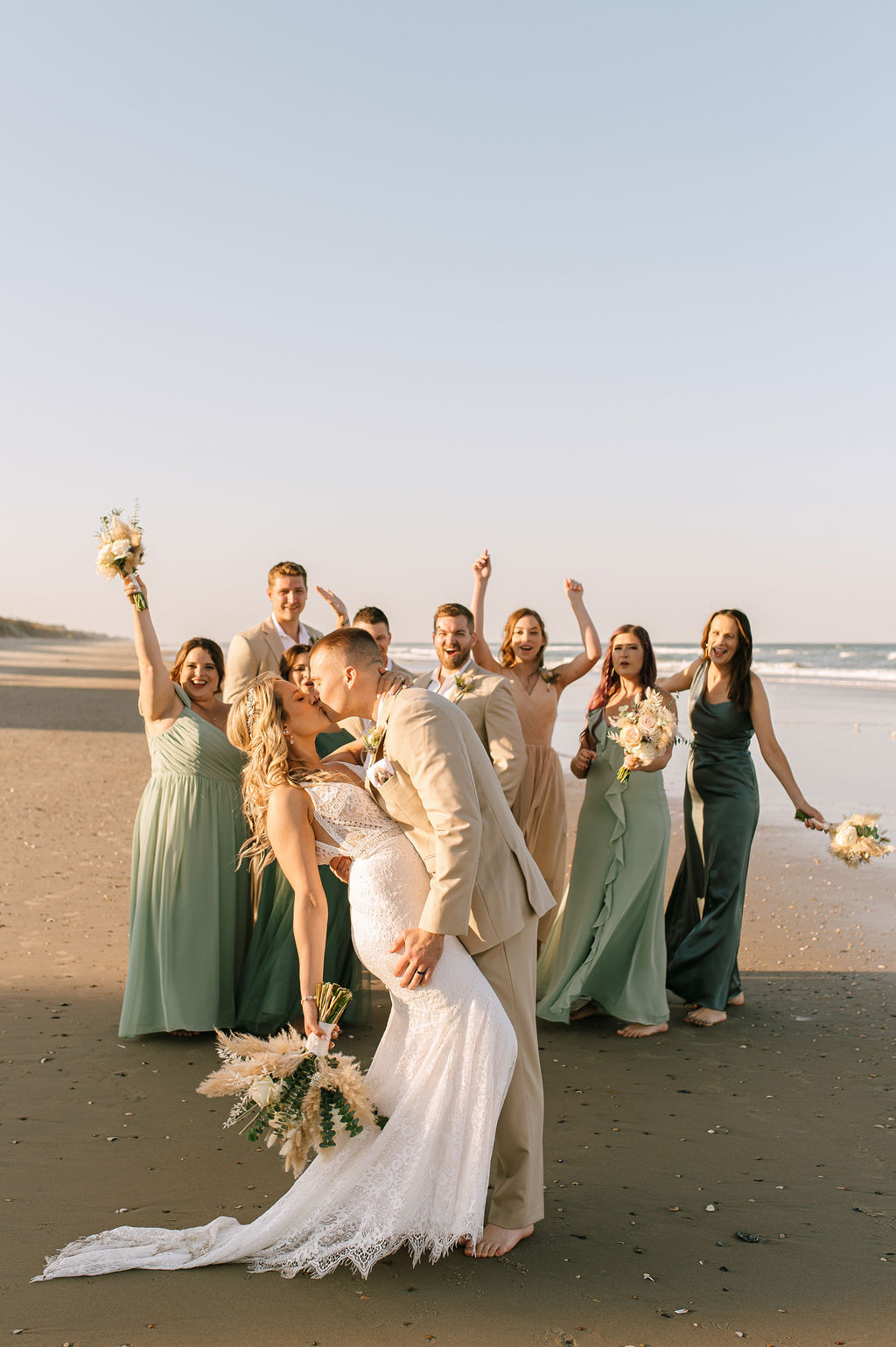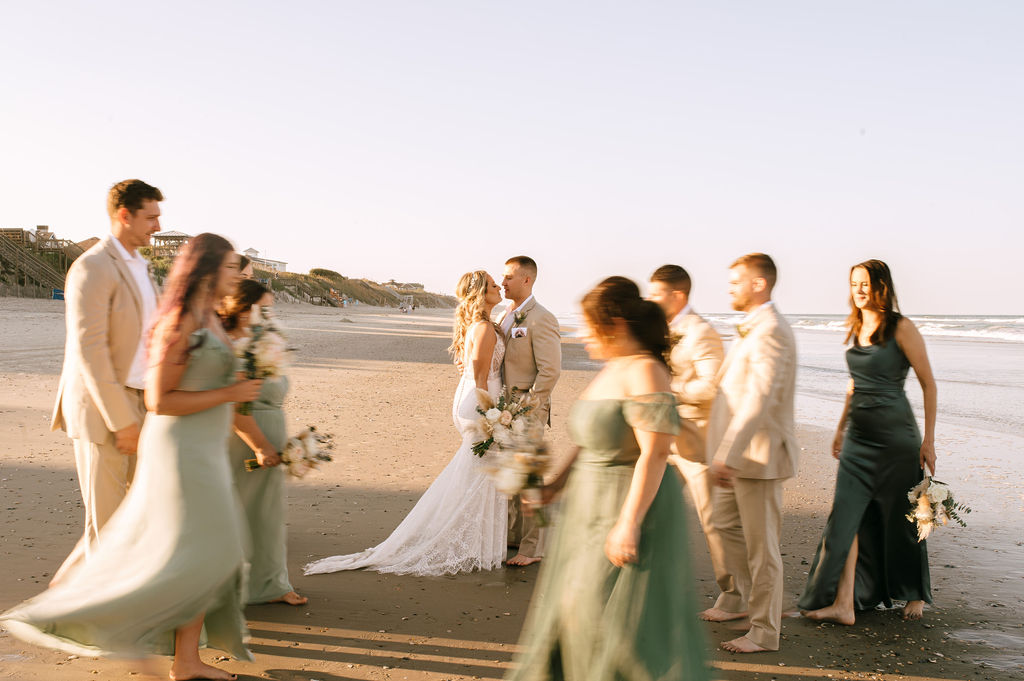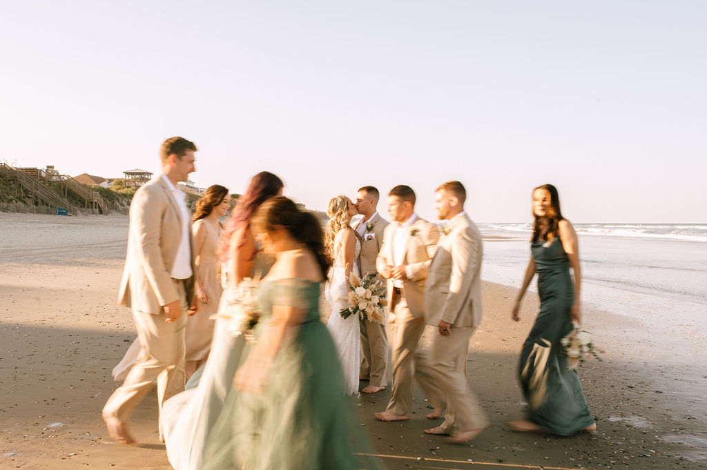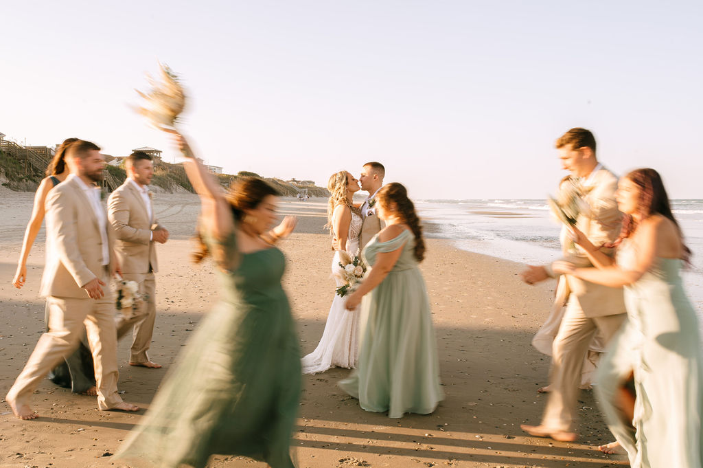 The design reflected the colors of the coast itself — soft neutrals, sandy taupes, and shades of the sea. Every element was curated to feel harmonious with the natural landscape, allowing the beauty of the Outer Banks to shine through effortlessly. Textural linens, natural florals, and wooden accents created a palette that felt timeless yet distinctly coastal. Guests enjoyed cocktails overlooking the dunes and danced under a canopy of stars — a true Outer Banks wedding weekend to remember.