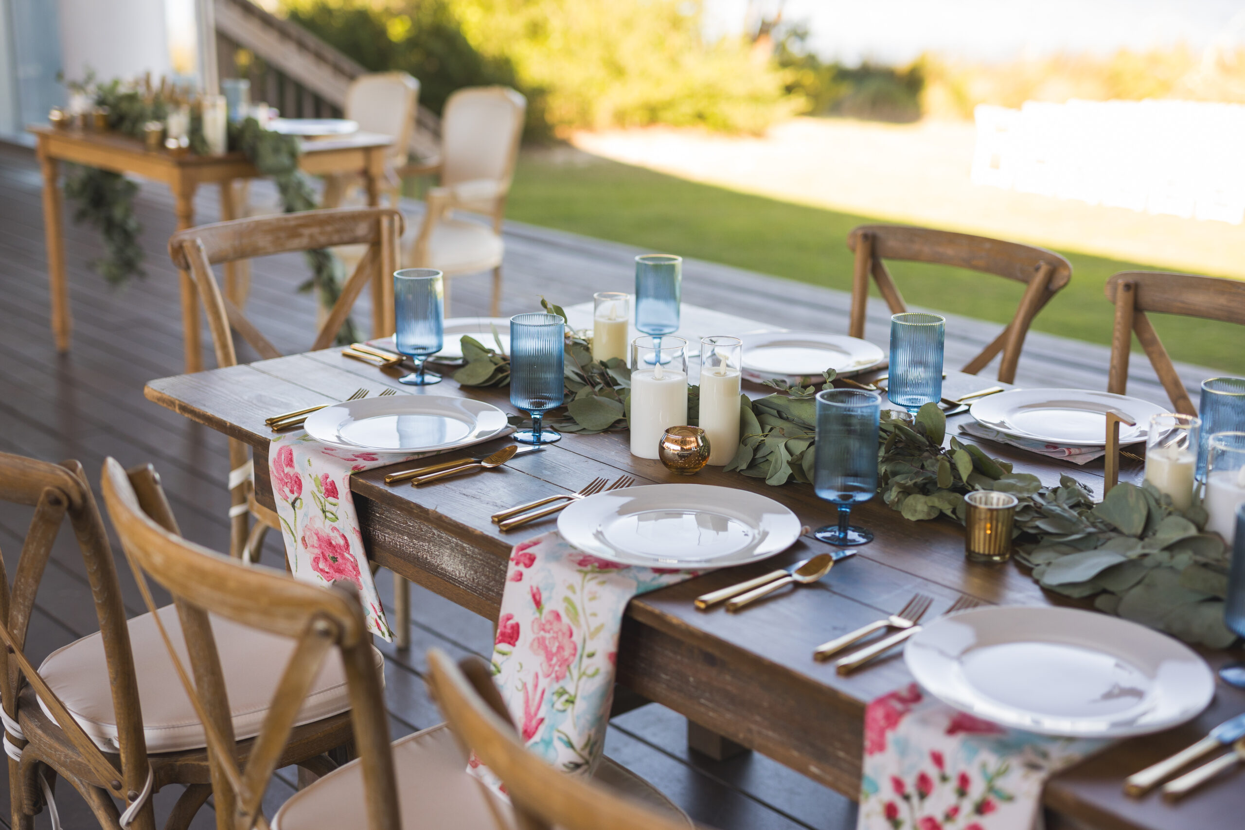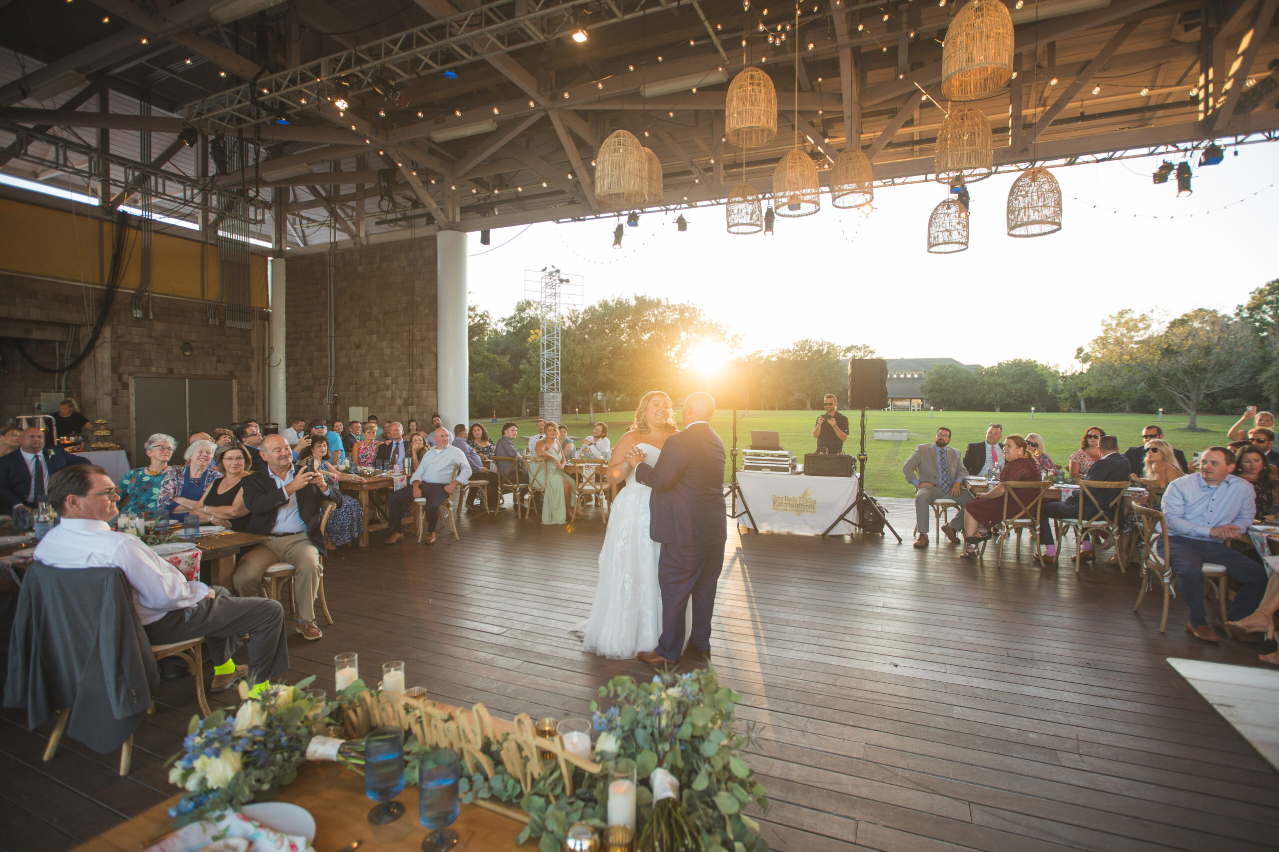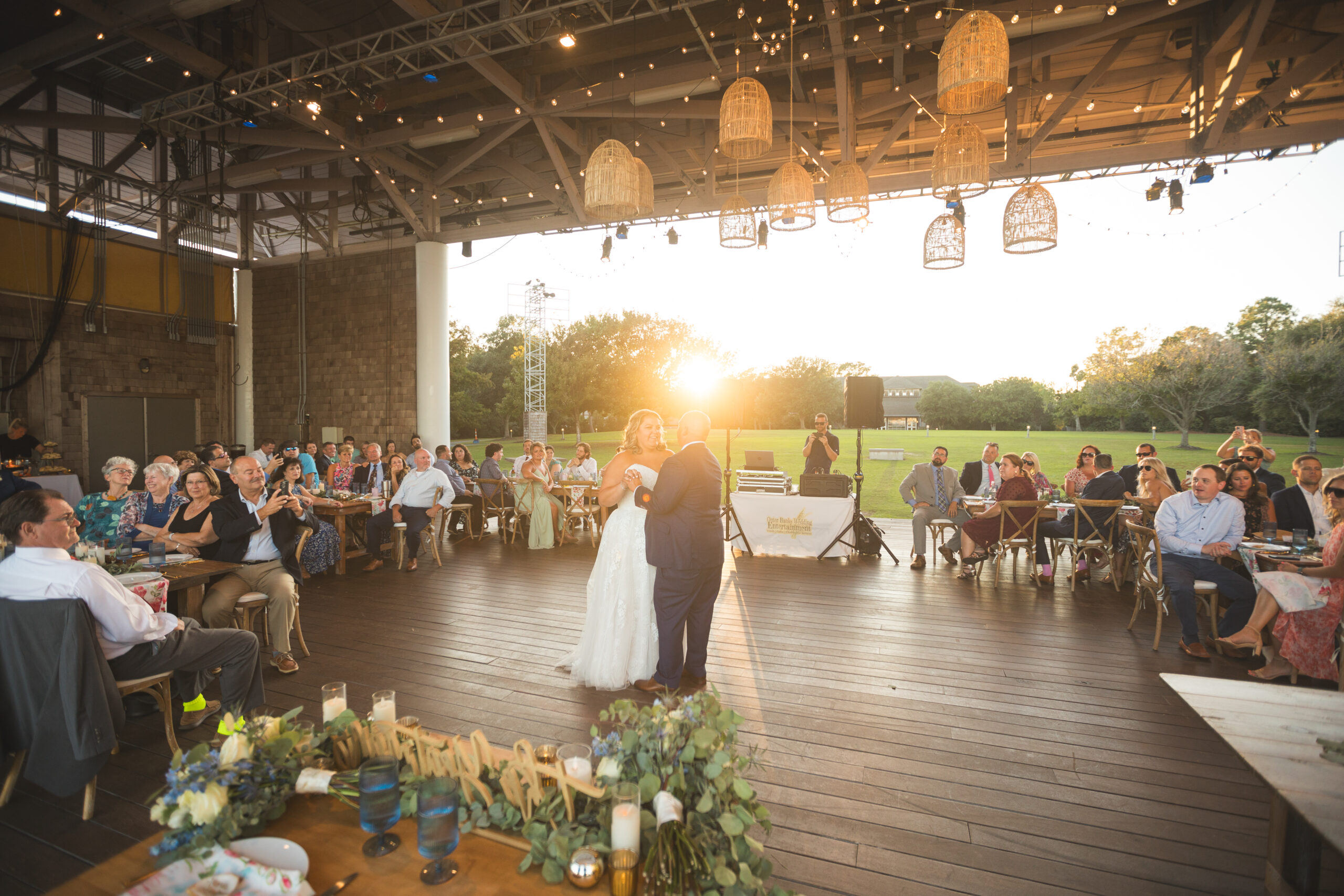 With a soundfront ceremony, a reception overlooking the water, and a design that embraced coastal blues and greens with just a pop of pink, their wedding struck the perfect balance between effortless Outer Banks beauty and refined celebration. A few of our favorite details were the custom bar that became a focal point and the pattern napkins that brought a pop and visual interest to the table design!