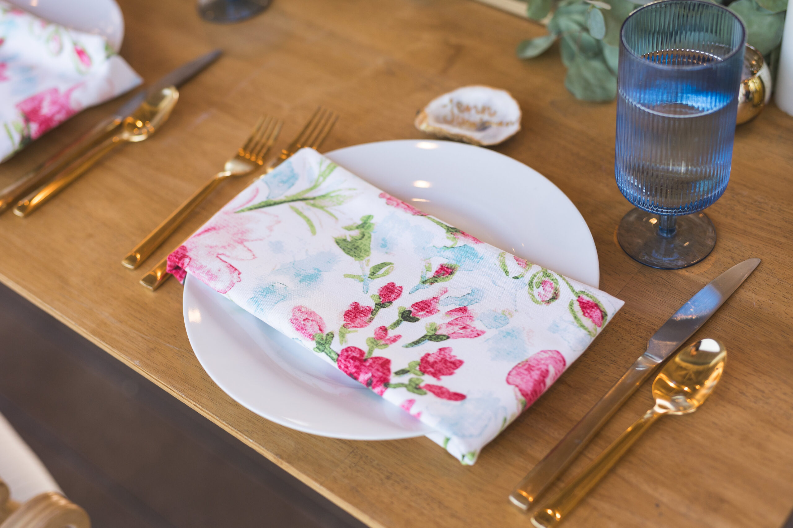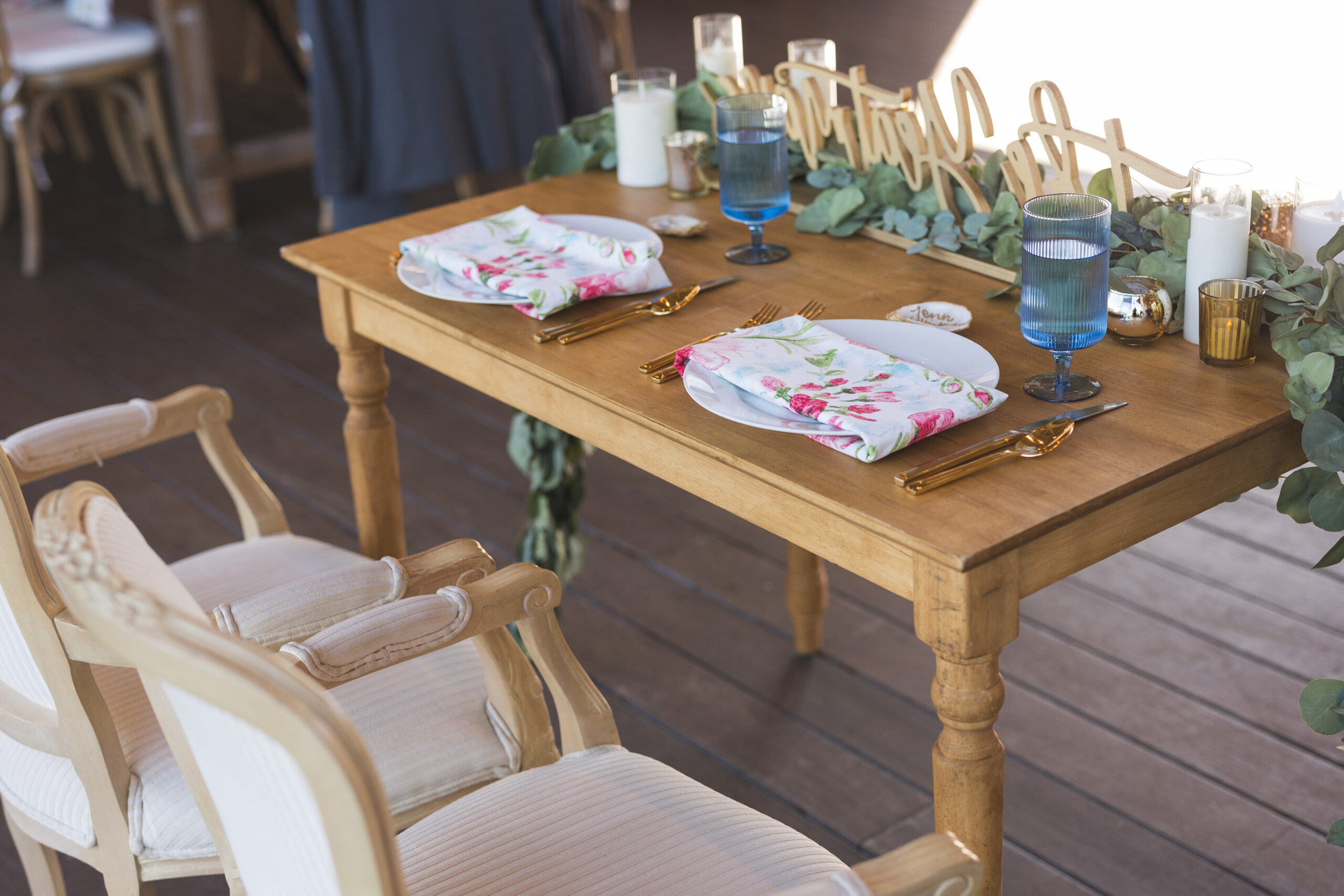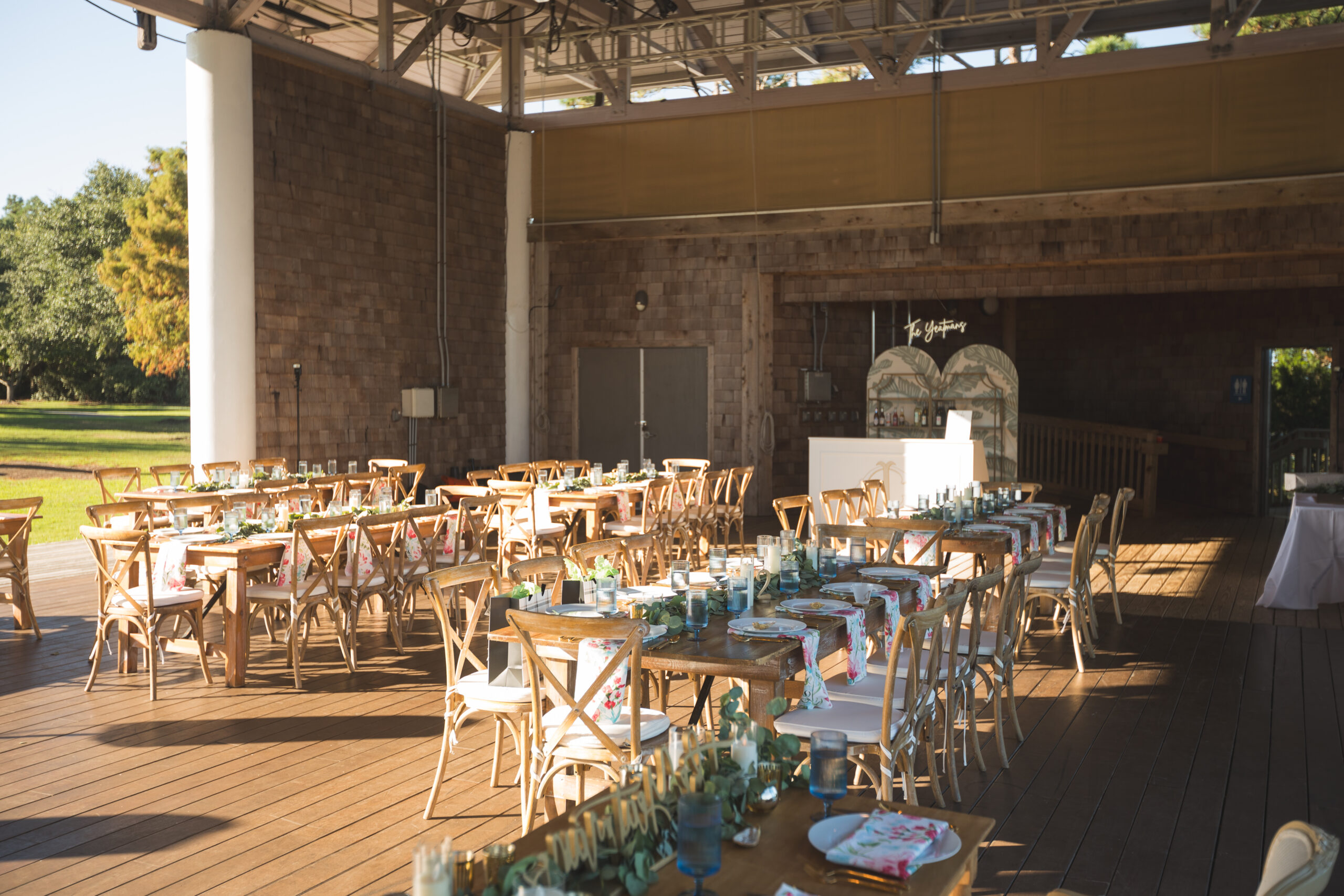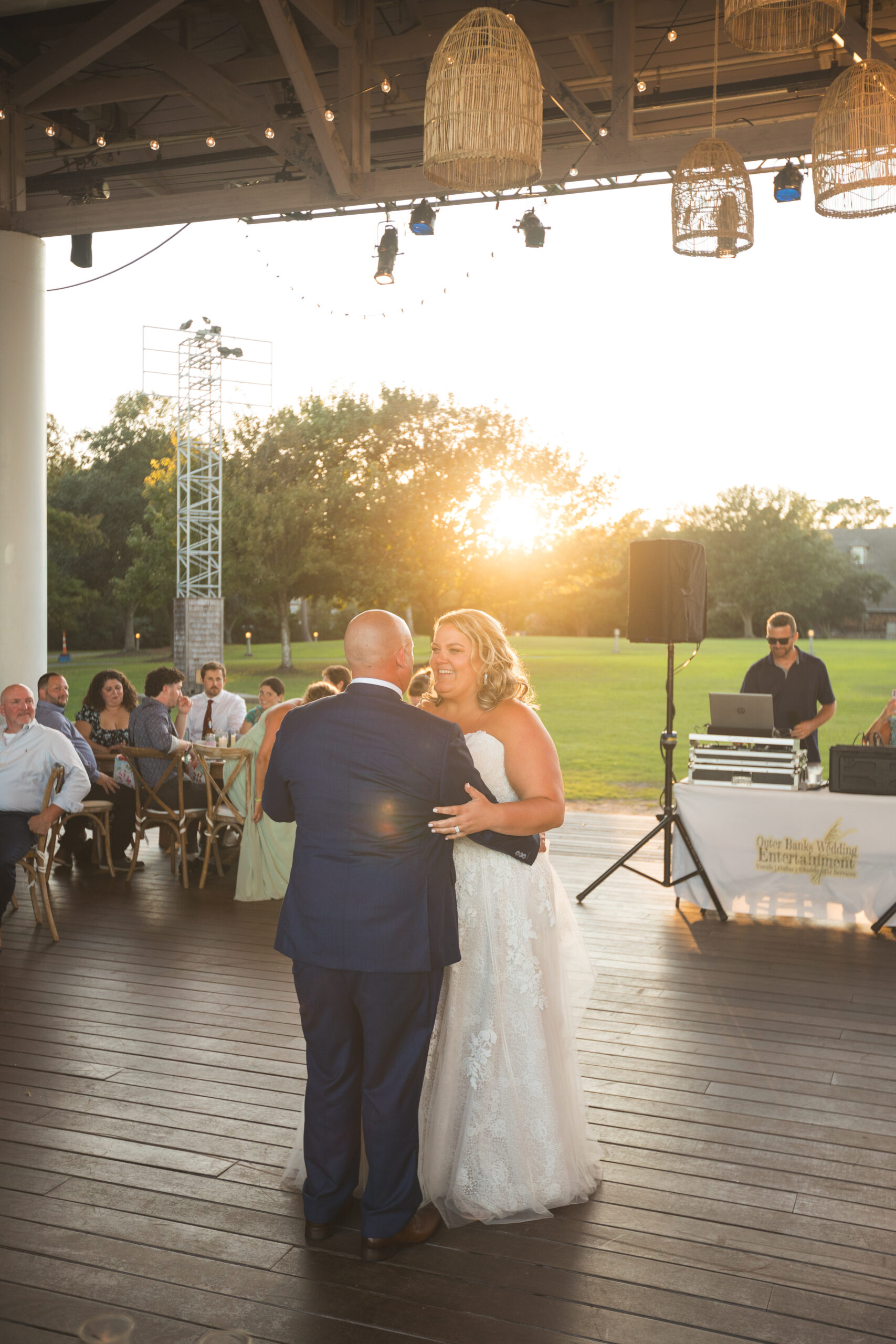 With a soundfront ceremony, a reception overlooking the water, and a design that embraced coastal blues and greens with just a pop of pink, their wedding struck the perfect balance between effortless Outer Banks beauty and refined celebration. A few of our favorite details were the custom bar that became a focal point and the pattern napkins that brought a pop and visual interest to the table design!