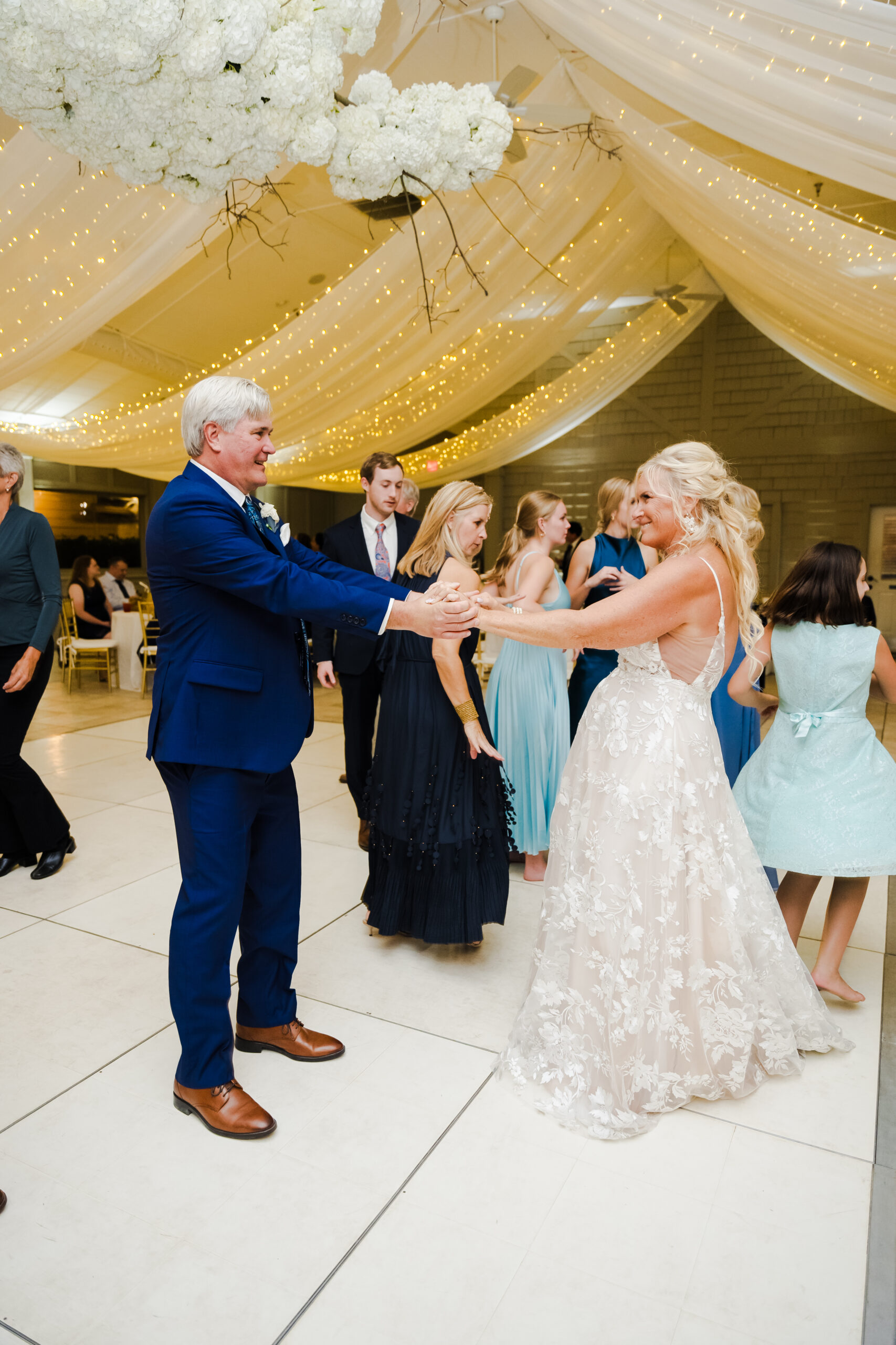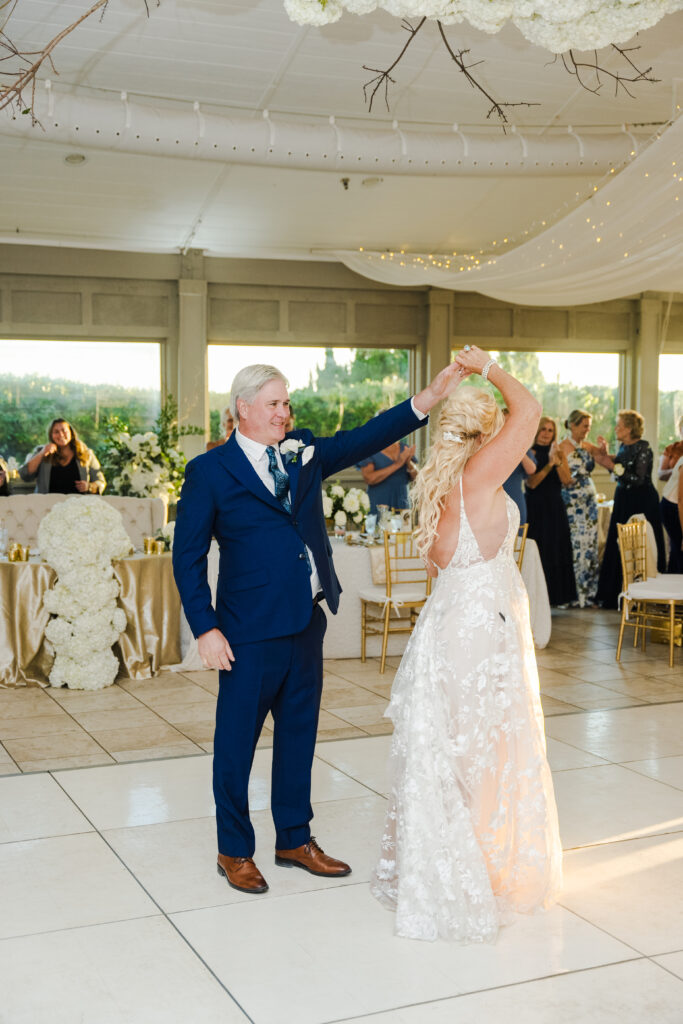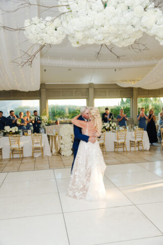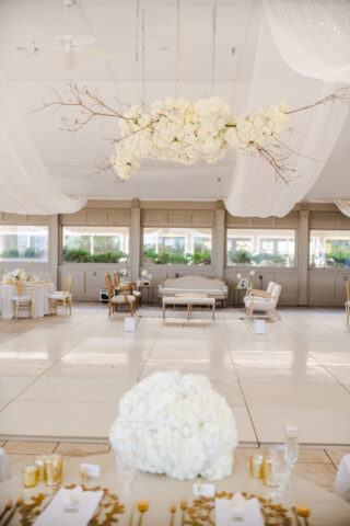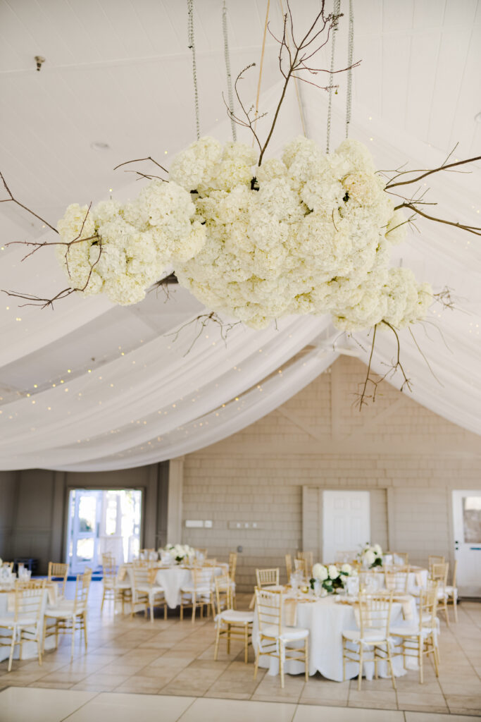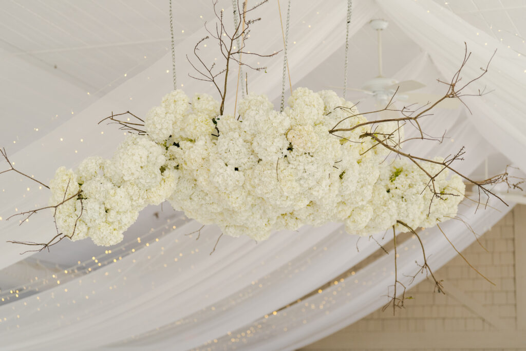 The heart of the reception was an unforgettable hydrangea “cloud” installation floating above the dance floor. Light, airy, and lush, the installation transformed the space and added a sense of movement and softness overhead. It became a focal point for the evening — framing first dances, late-night celebration, and unforgettable moments beneath its glow.