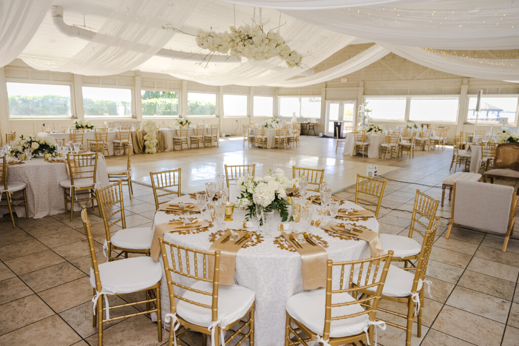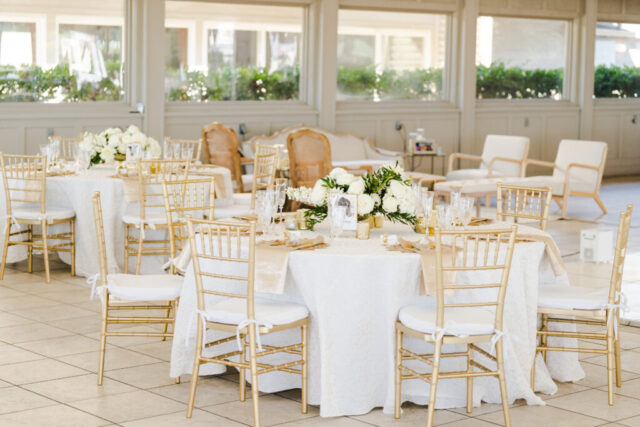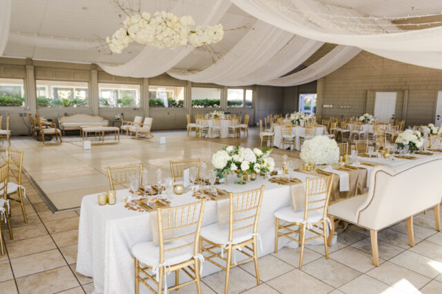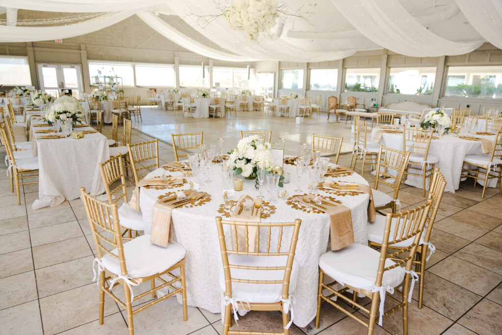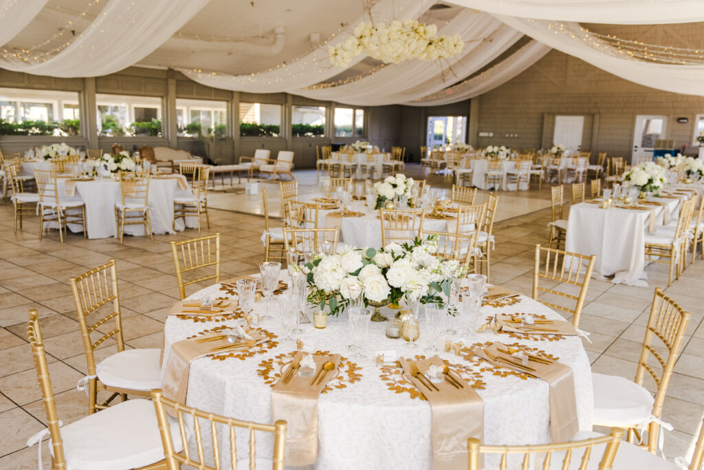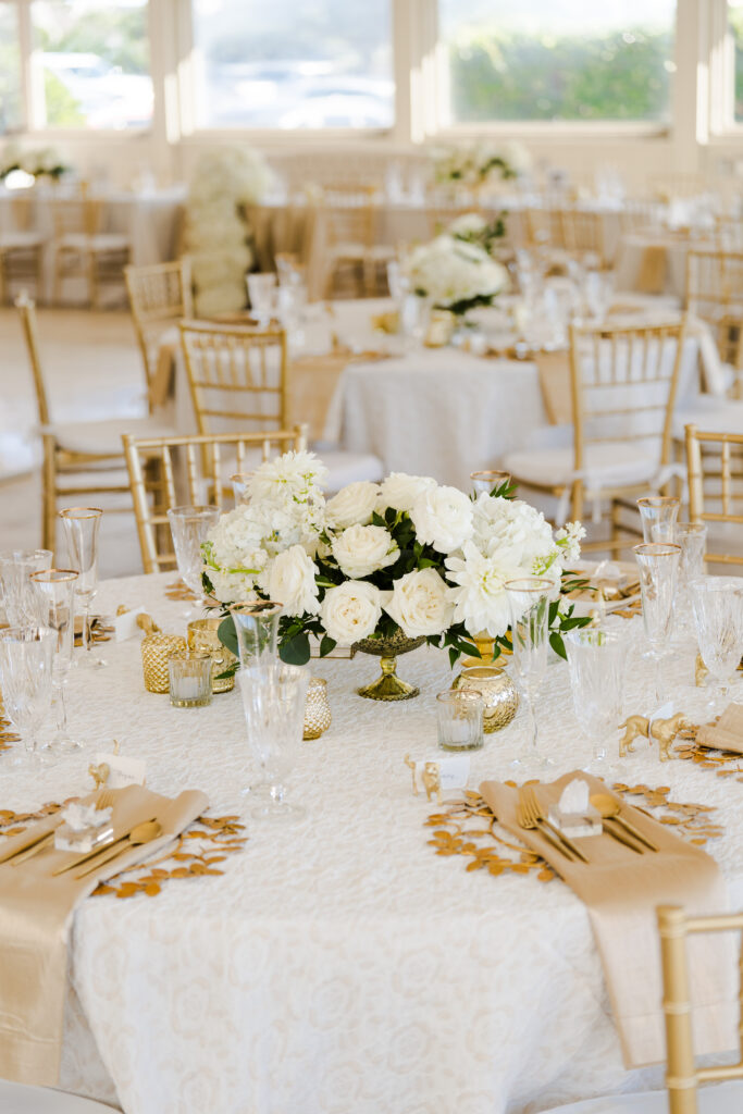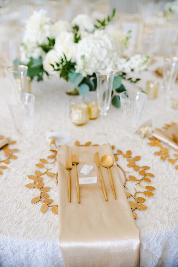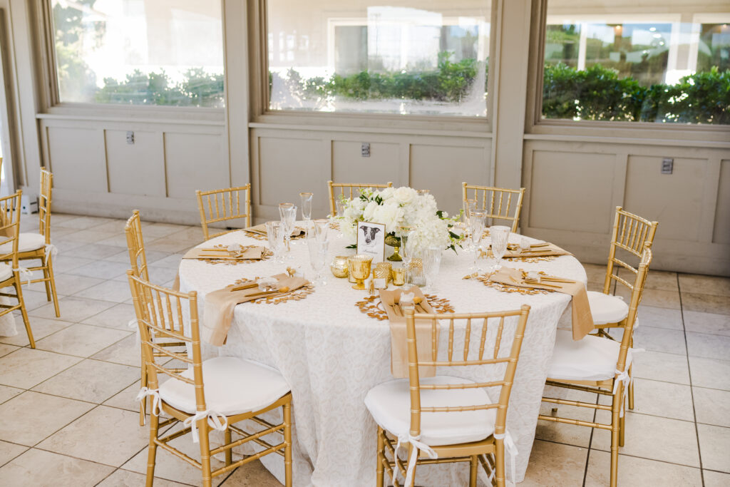 The design centered on a classic but elevated white and gold palette, layered with rich texture to create depth, warmth, and understated glamour. Soft linens, metallic accents, and refined finishes came together in a way that felt modern yet timeless — a perfect reflection of high-end coastal wedding style.