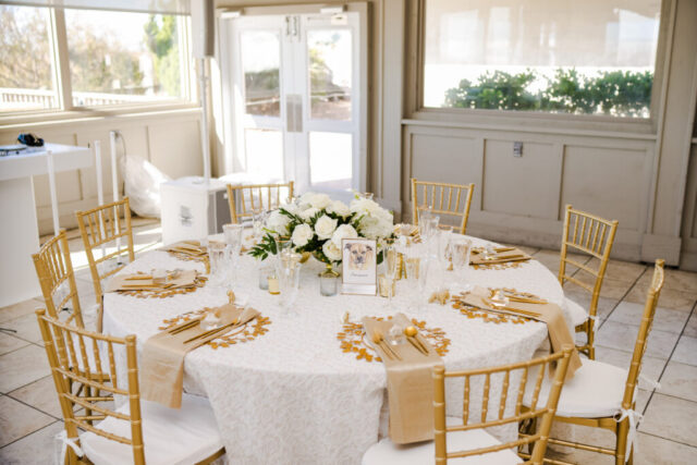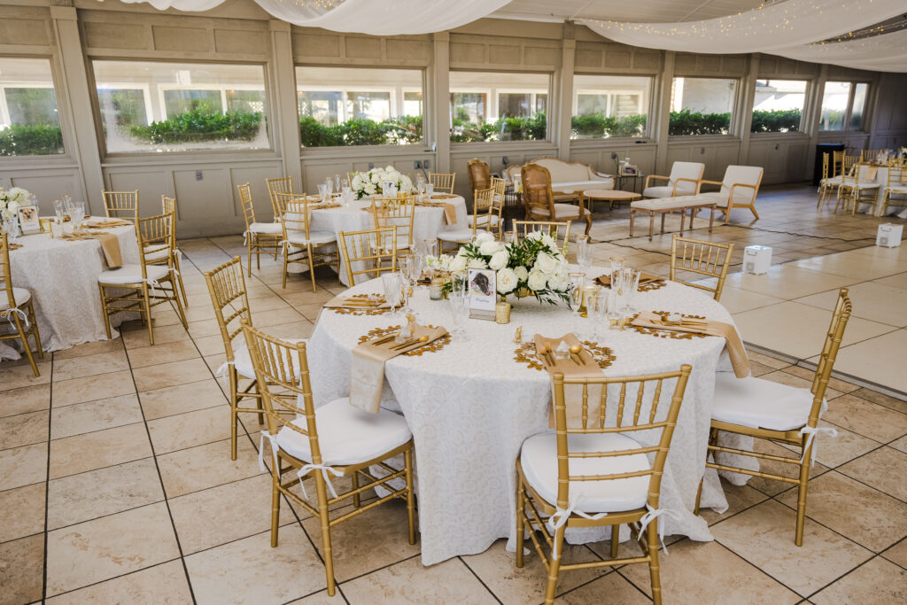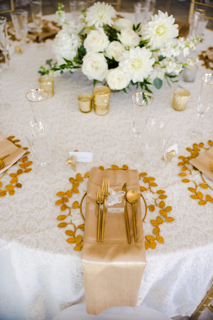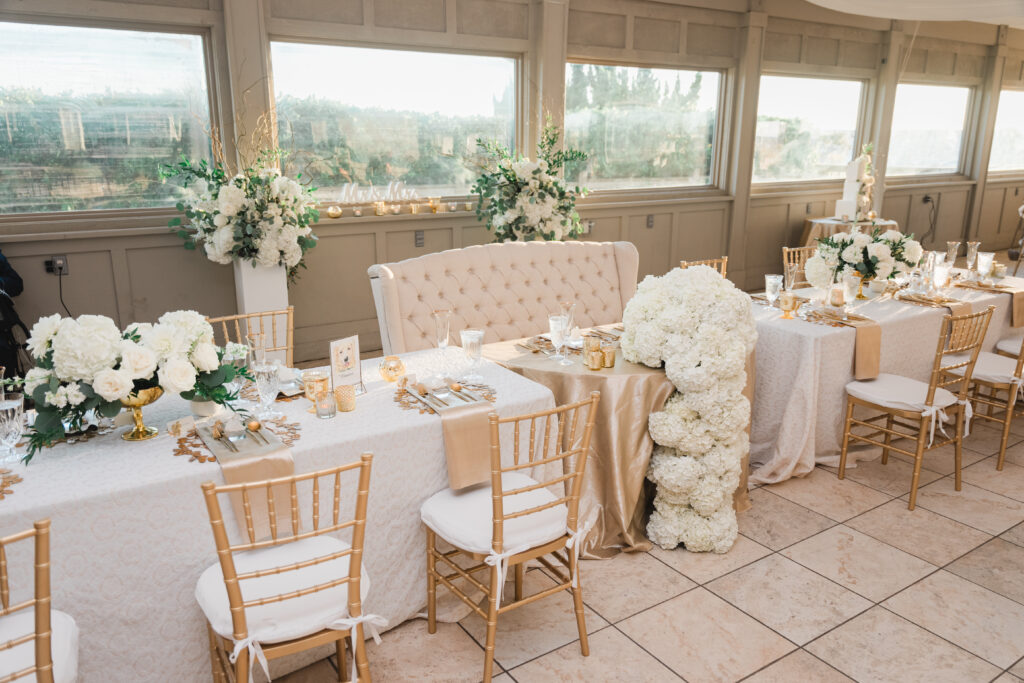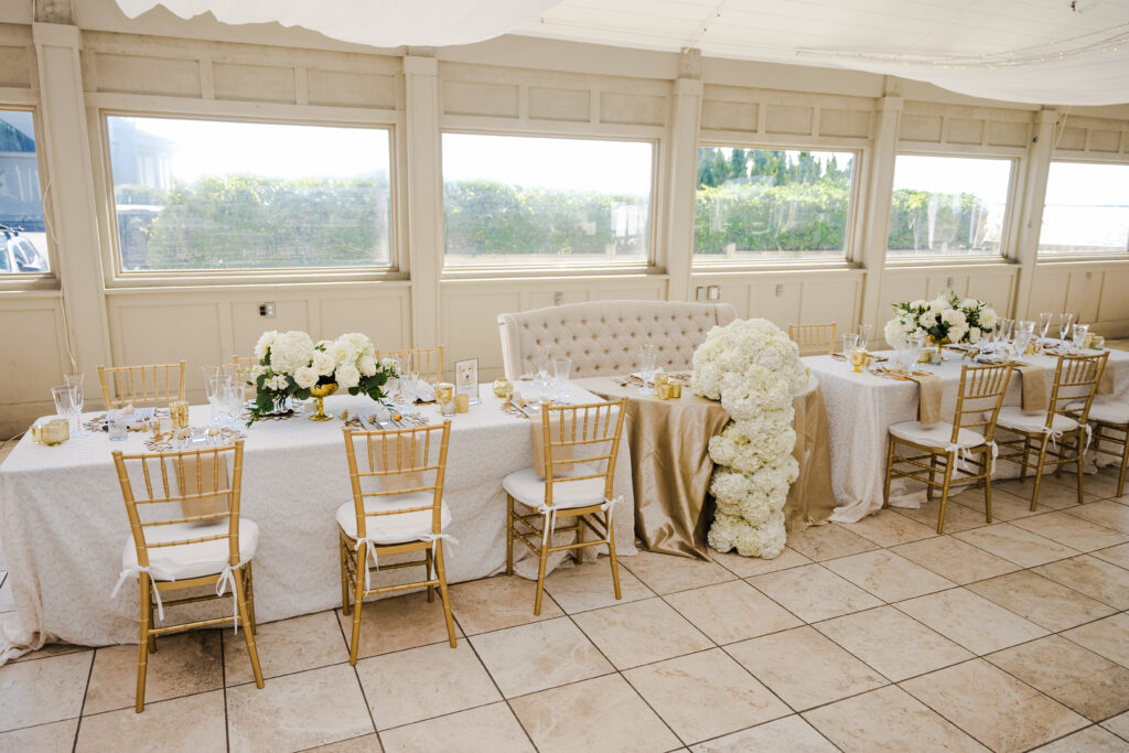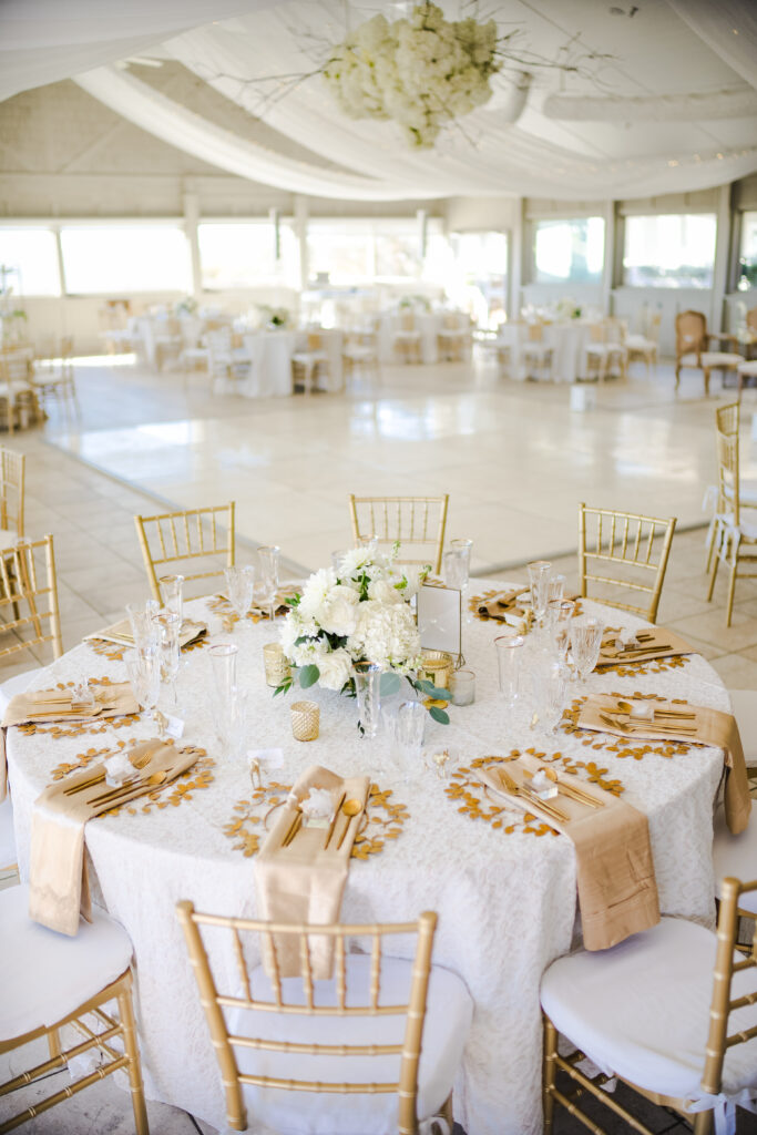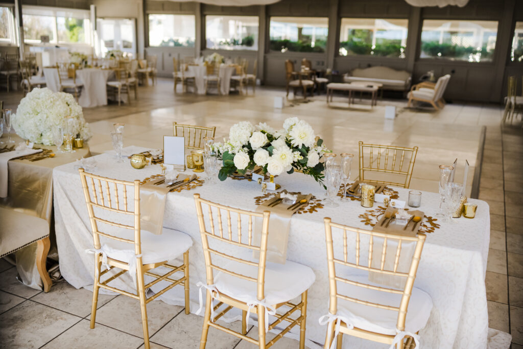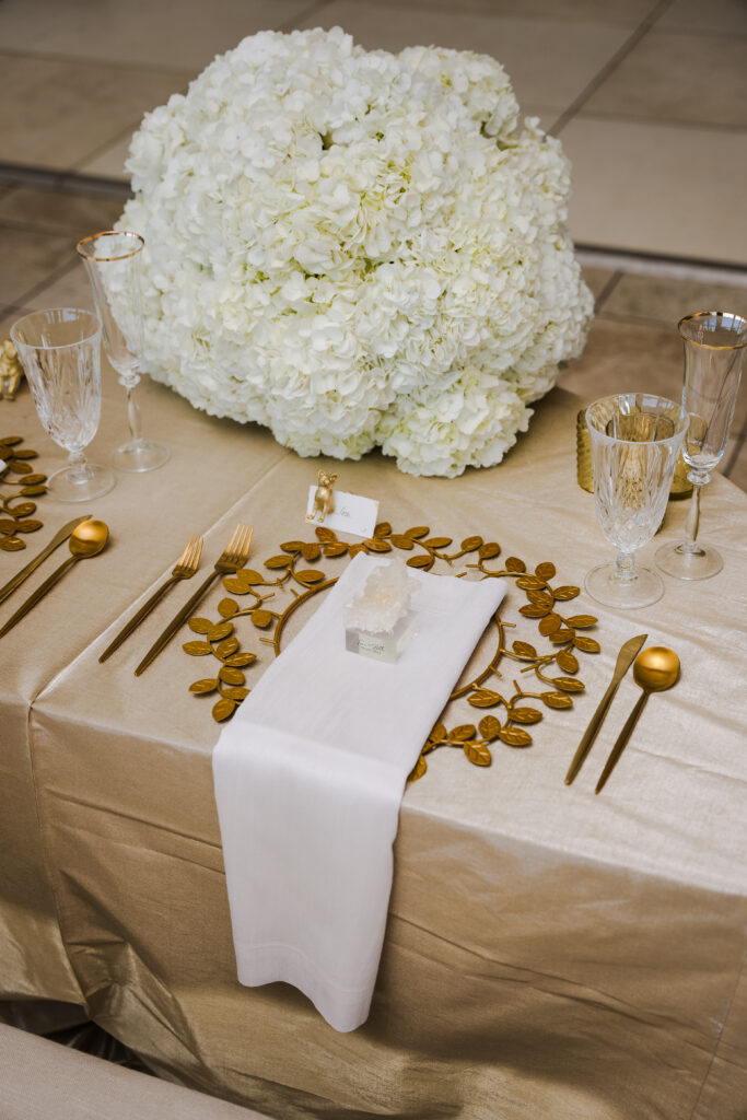 The design centered on a classic but elevated white and gold palette, layered with rich texture to create depth, warmth, and understated glamour. Soft linens, metallic accents, and refined finishes came together in a way that felt modern yet timeless — a perfect reflection of high-end coastal wedding style.