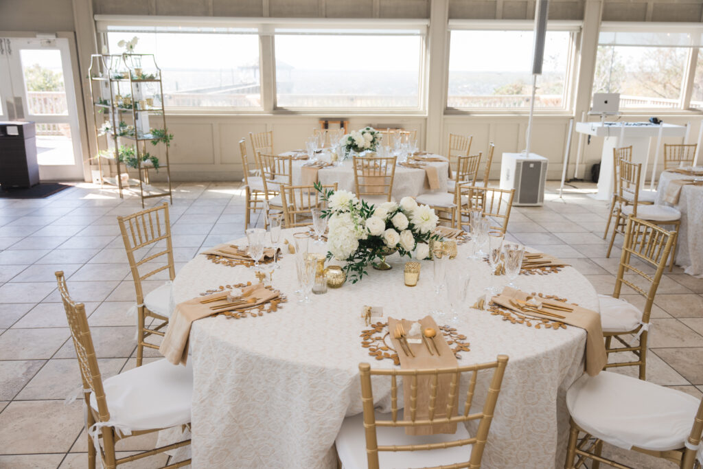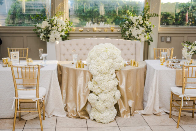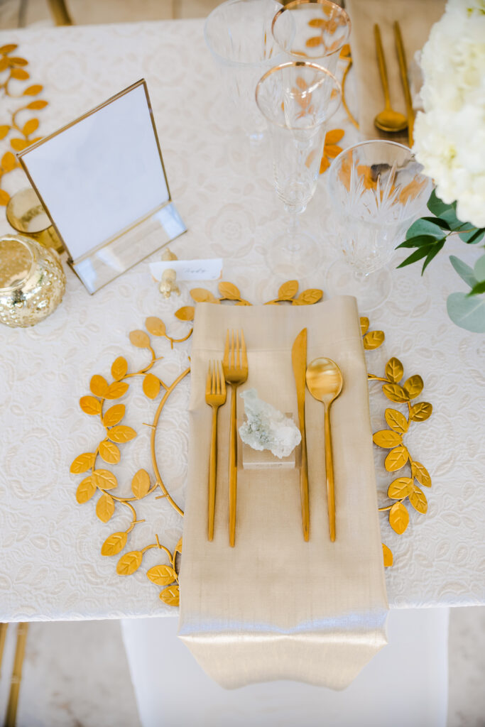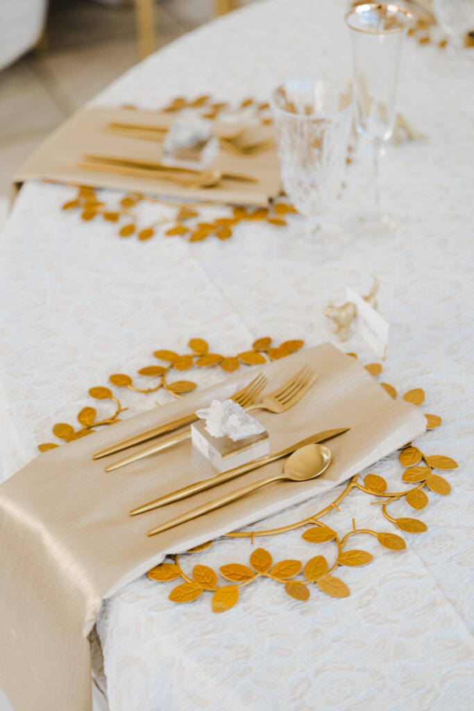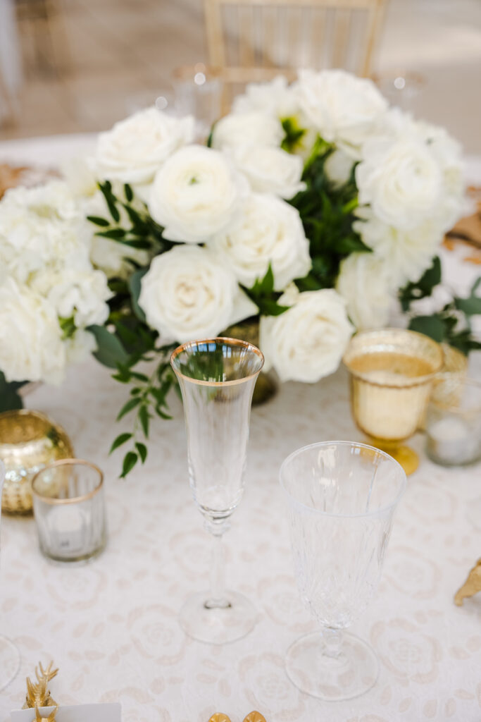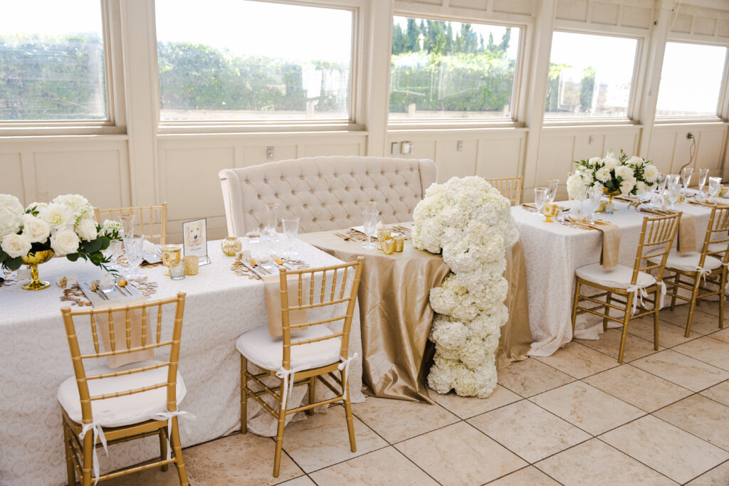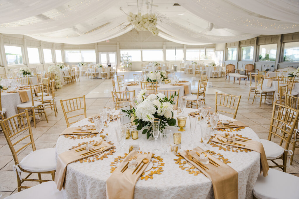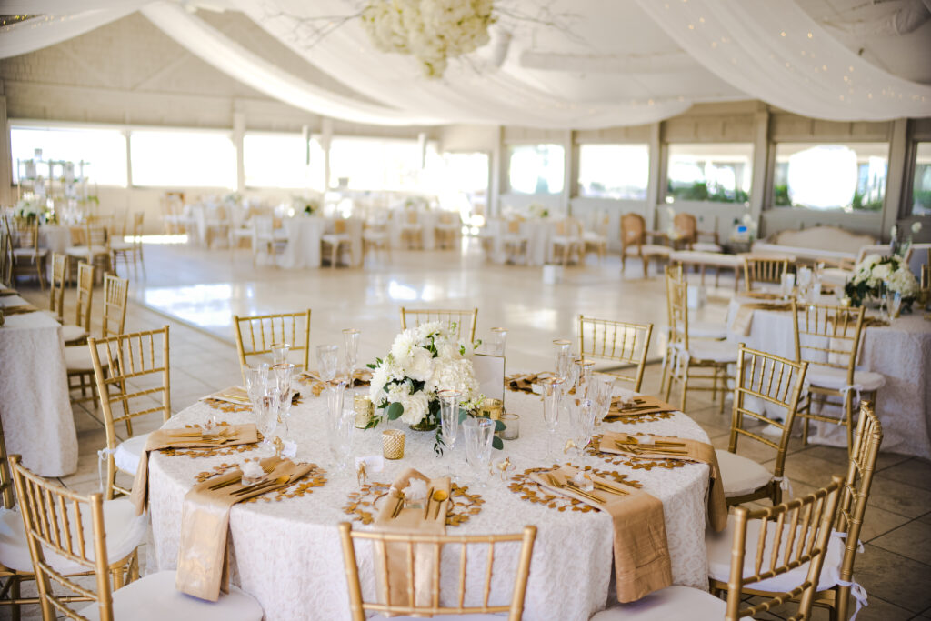 The design centered on a classic but elevated white and gold palette, layered with rich texture to create depth, warmth, and understated glamour. Soft linens, metallic accents, and refined finishes came together in a way that felt modern yet timeless — a perfect reflection of high-end coastal wedding style.