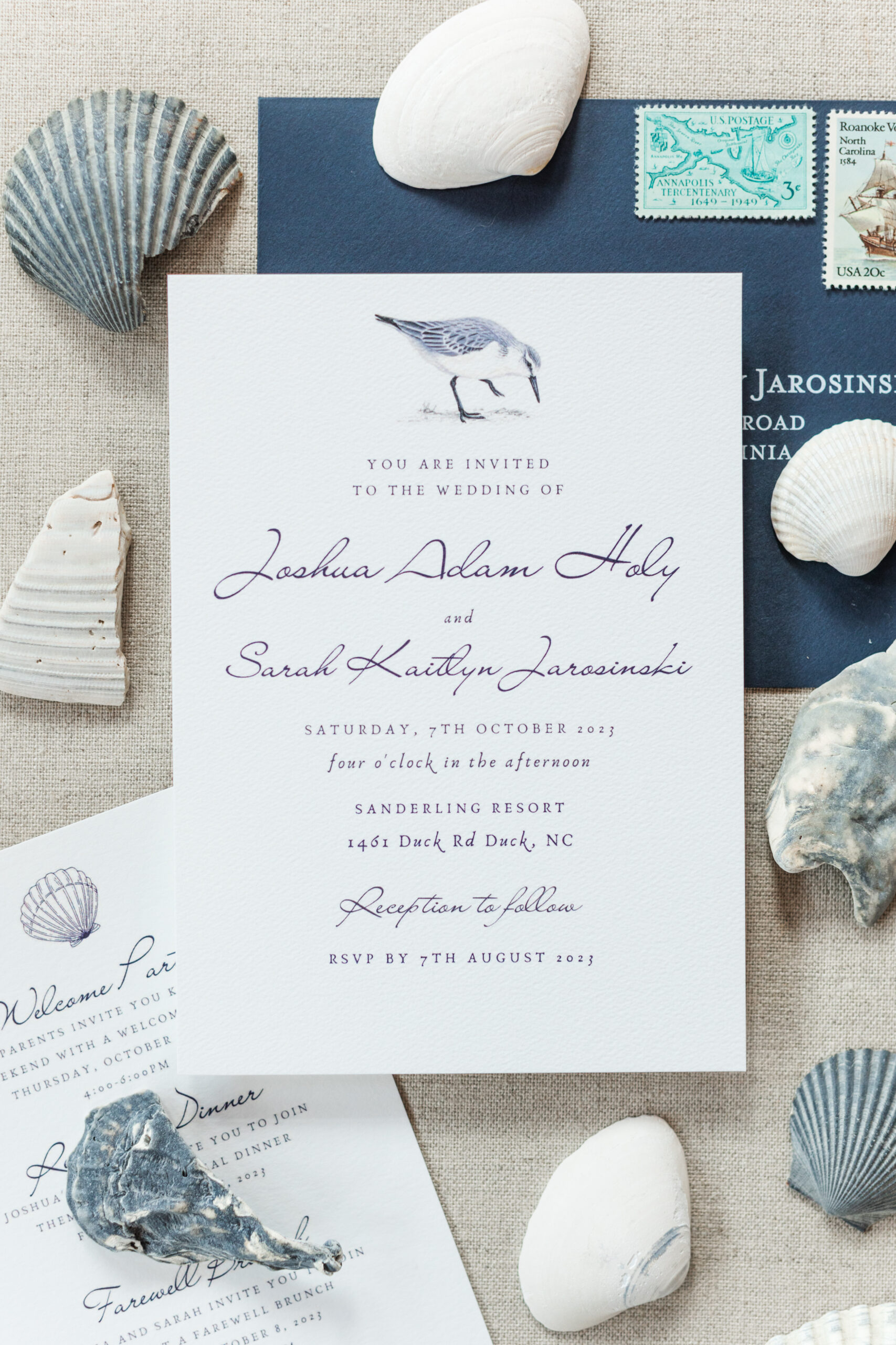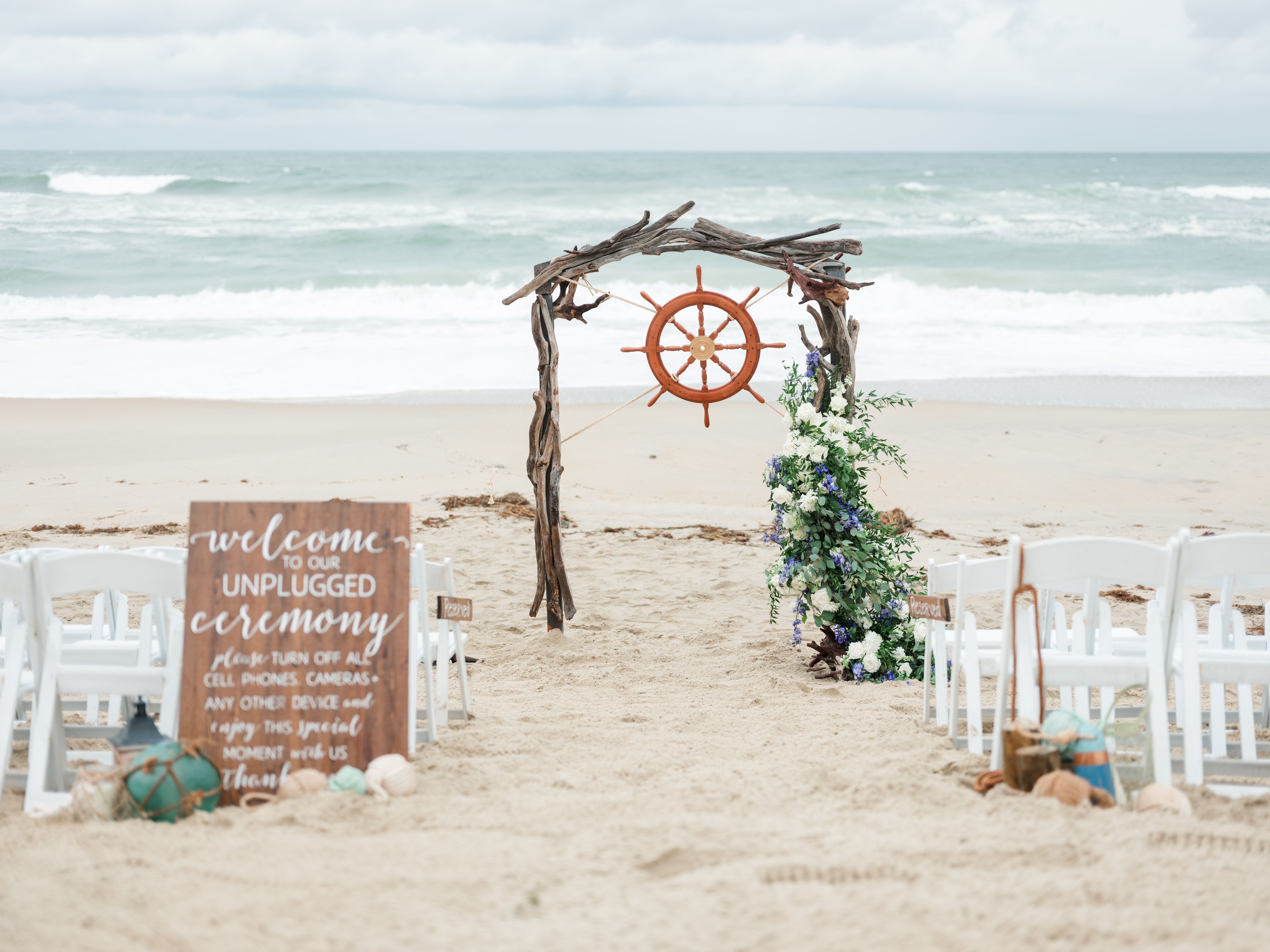 Sarah & Josh knew they wanted their Sanderling wedding to feel personal, intentional, and reflective of the place they love most. The nautical elements were not simply decorative—they were woven throughout the day as a tribute to the ocean, service, and the couple’s shared story.