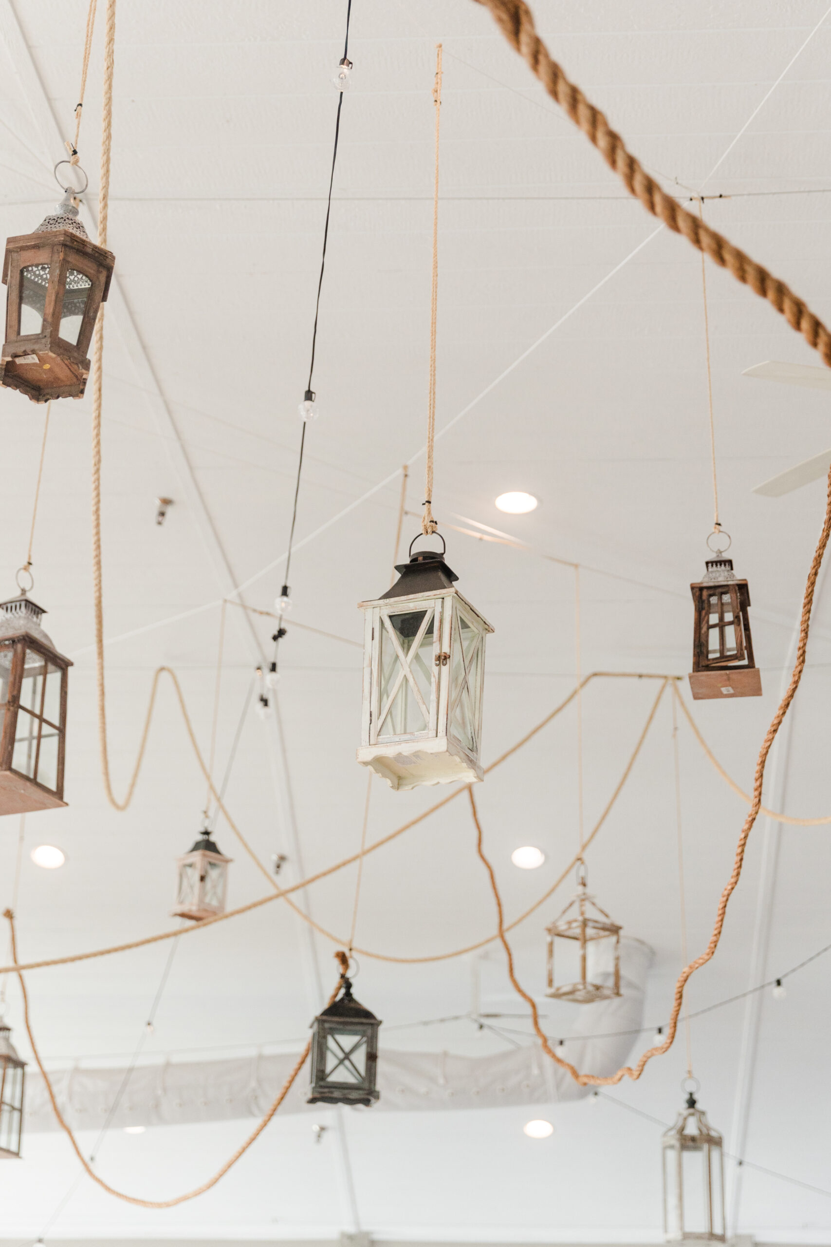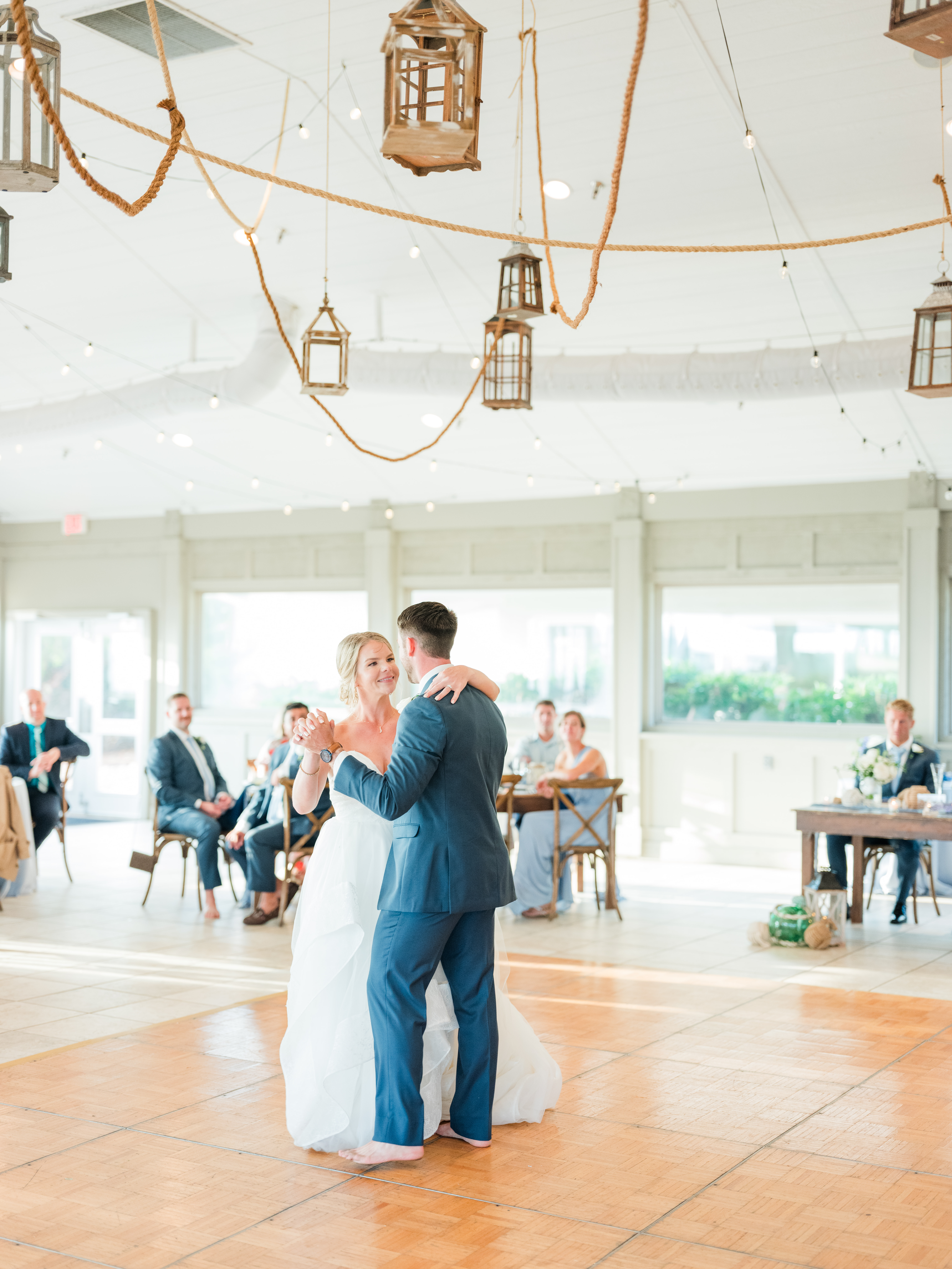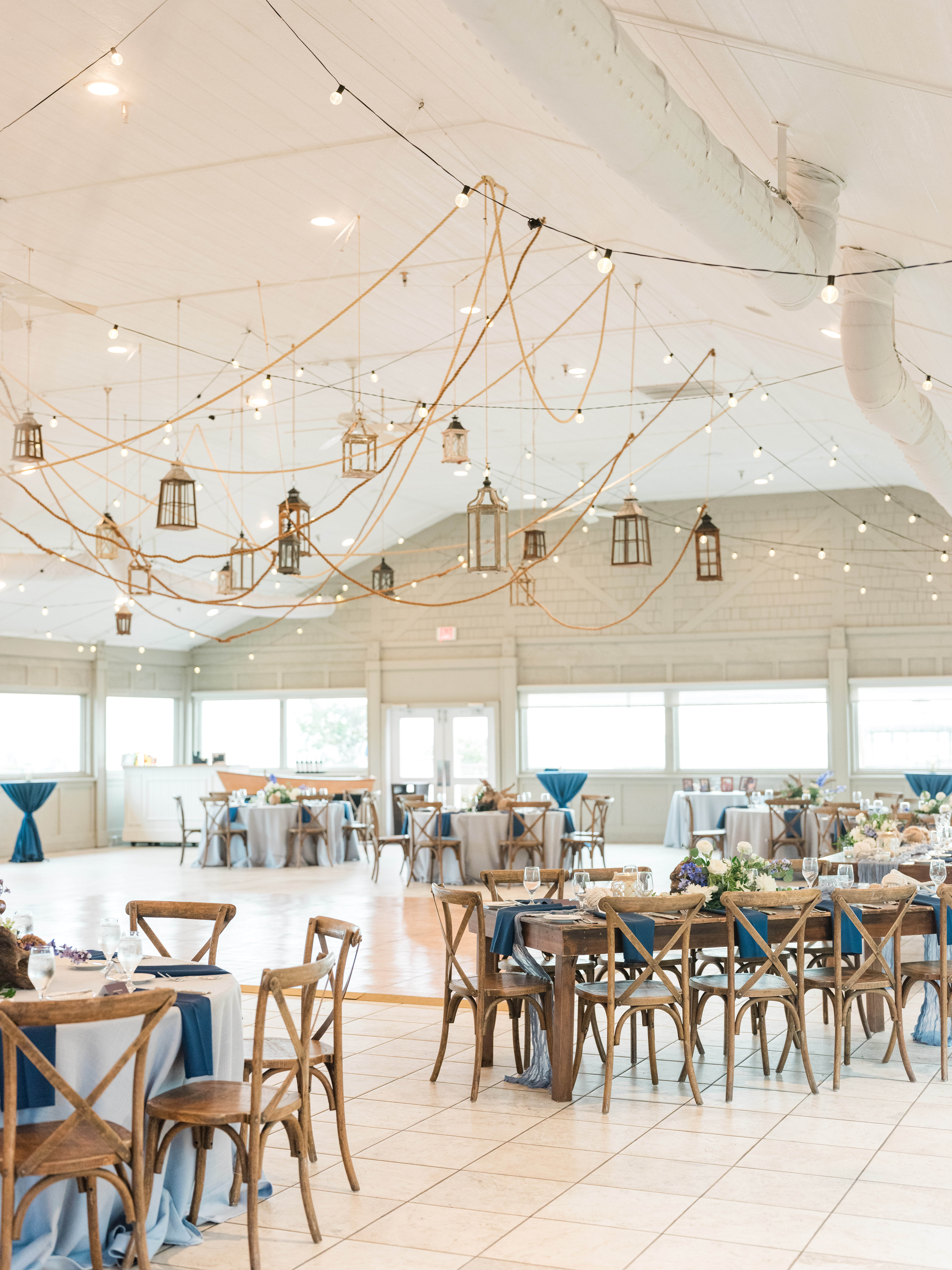 From the buoy accents to the driftwood touches, every detail celebrated the spirit of the Outer Banks while maintaining the clean, refined aesthetic that defines the Sanderling’s coastal luxury. Pops of navy, natural textures, and crisp neutrals created a timeless palette that felt both relaxed and elevated. Maritime knots and buoy markers added meaning and charm while staying true to the couple’s elegant vision. The true showstopper though was the custom rope-and-lantern ceiling installation—a sculptural overhead moment that transformed the reception space and brought the nautical theme to life in a way that felt artistic, modern, and completely unforgettable. It became the focal point of the evening!
