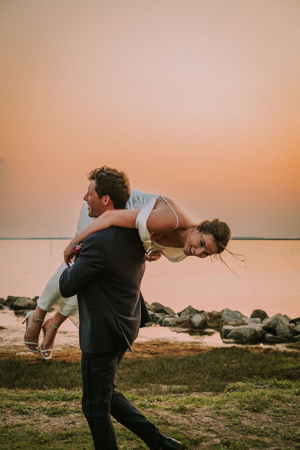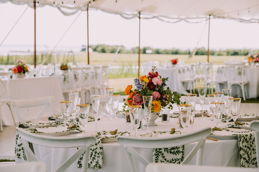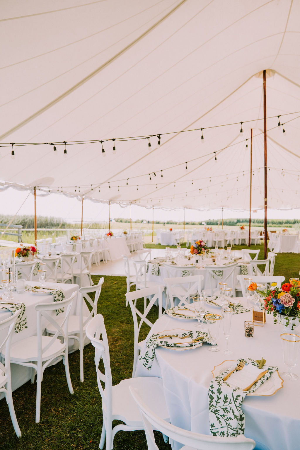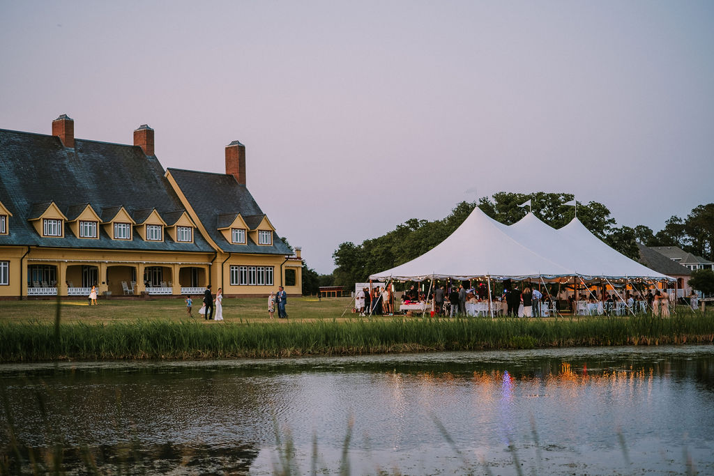 Guests enjoyed cocktail hour overlooking the Currituck Sound, followed by dinner and dancing beneath a stunning sailcloth tent that glowed as the sun set. Every detail was crafted to balance elegance with fun, creating a celebration that was as joyful as it was beautiful.