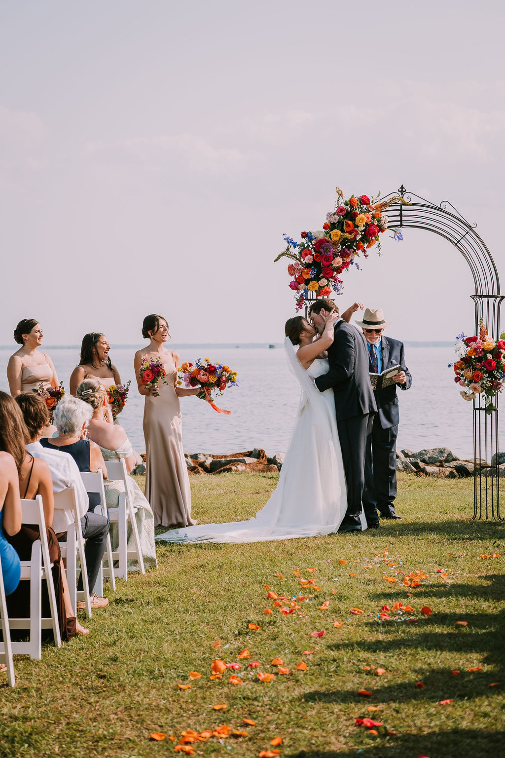 For Aimee & Joe, the Whalehead Club offered the perfect canvas for a day that was both timeless and joyfully bold. Their Corolla wedding was a lively mix of bright colors, bold florals, and an incredible sailcloth tent that brought the celebration to life against the soundfront backdrop.