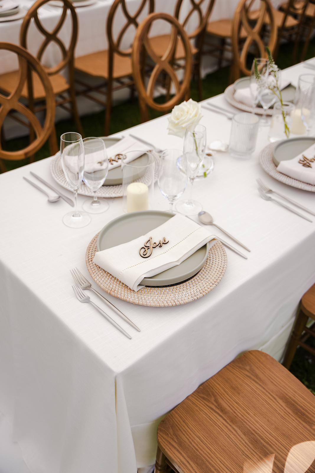Under a sailcloth tent, guests were welcomed into a space layered with soft neutrals, natural textures, and airy linens — a design that felt both timeless and fresh.